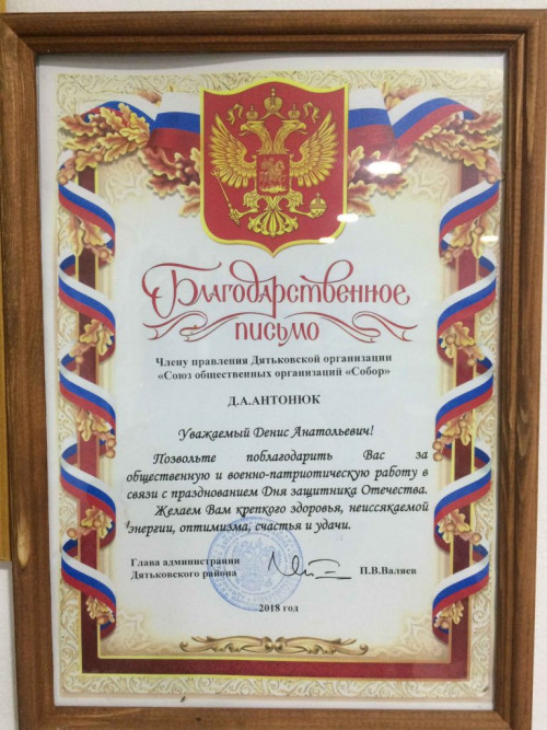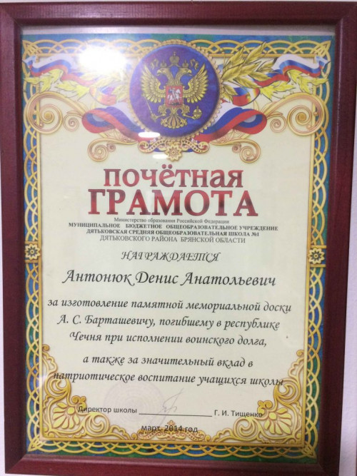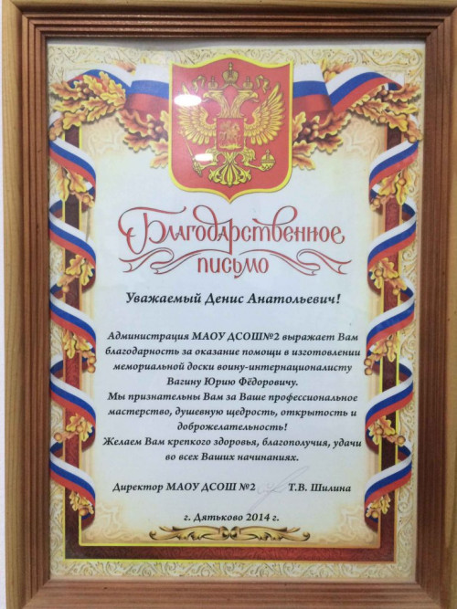 Совет депутатов и Администрация посёлка Бытошь благодарит предприятие "Граникум" за своевременное и качественное выполнение заказа к 75-й годовщине Победы в Великой Отечественной войне. Предприятие не только своевременно выполнено заказ, но и совершенно бесплатно, руководствуясь чувством патриотизма изготовило памятник воинам павшим в боях при освобождении п. Бытошь. Огромное вам спасибо!