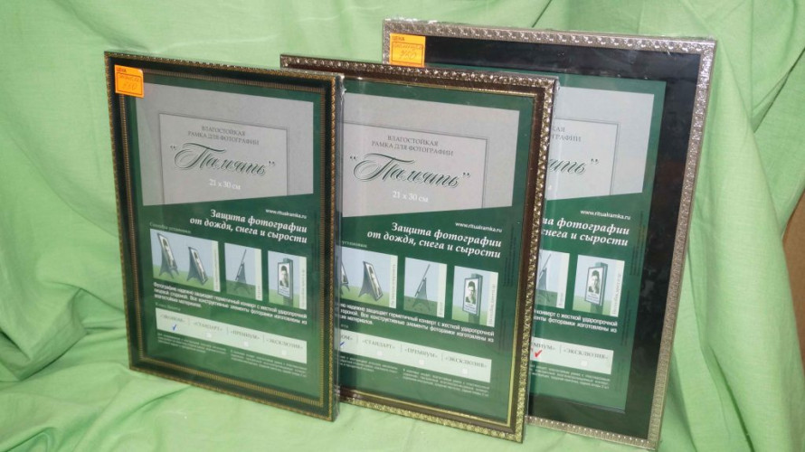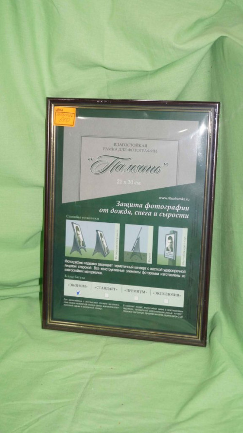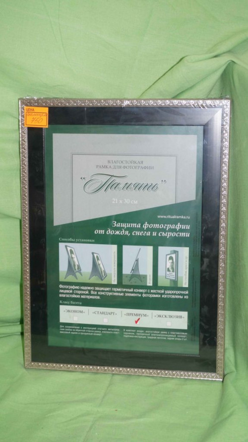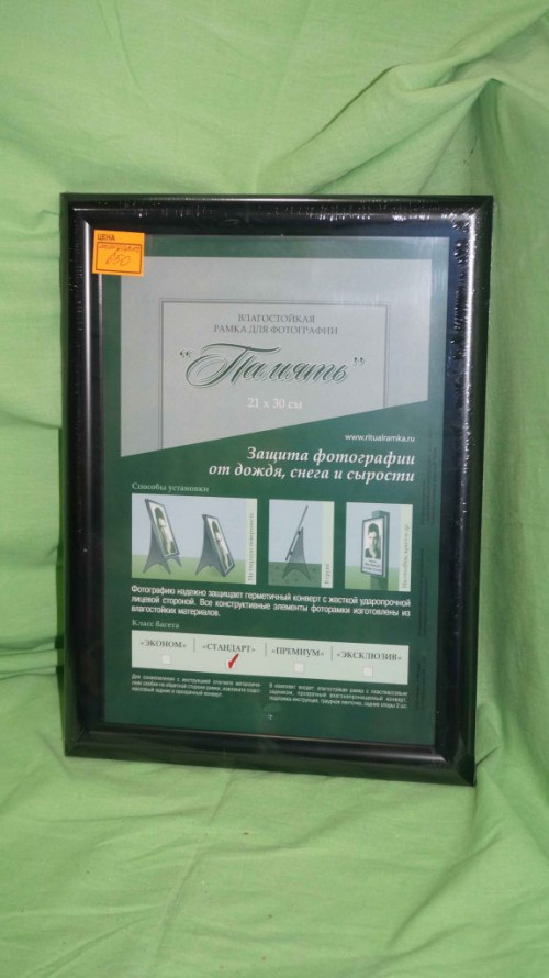 Рамки не боятся дождя, снега. В комплекте идёт подставка пластиковая, траурная лента чёрная, вкладыш герметичный для фотографии. Есть ушки для крепления на вертикальную поверхность. В наличии четыре класса: эконом, стандарт, премиум, эксклюзив. Различие в толщине багета и оформлении. В ассортименте разные цвета багета.